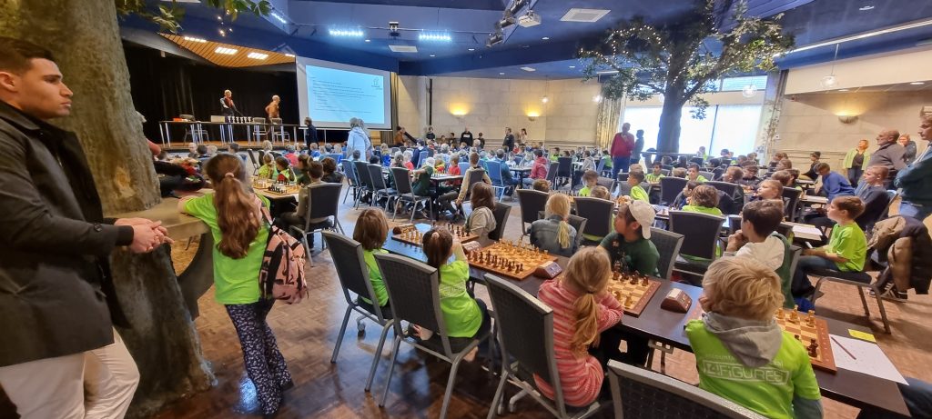Een van de wonderlijke dingen van dit toernooi is de manier waarop alle kinderen iedere ronde opnieuw hun juiste tafel weten te vinden. Het ziet er ontzettend chaotisch uit maar een paar minuten nadat we de indeling voor een nieuwe ronde op het scherm tonen zit toch steeds iedereen weer keurig achter het bord.